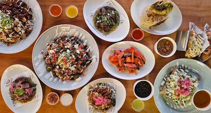 Sautéed adobo shrimp, caramelized cheese, cabbage, roasted poblano peppers, guacamole, pico de gallo, poblano cream, pickled red onions