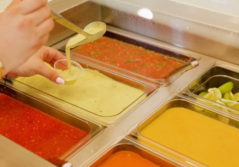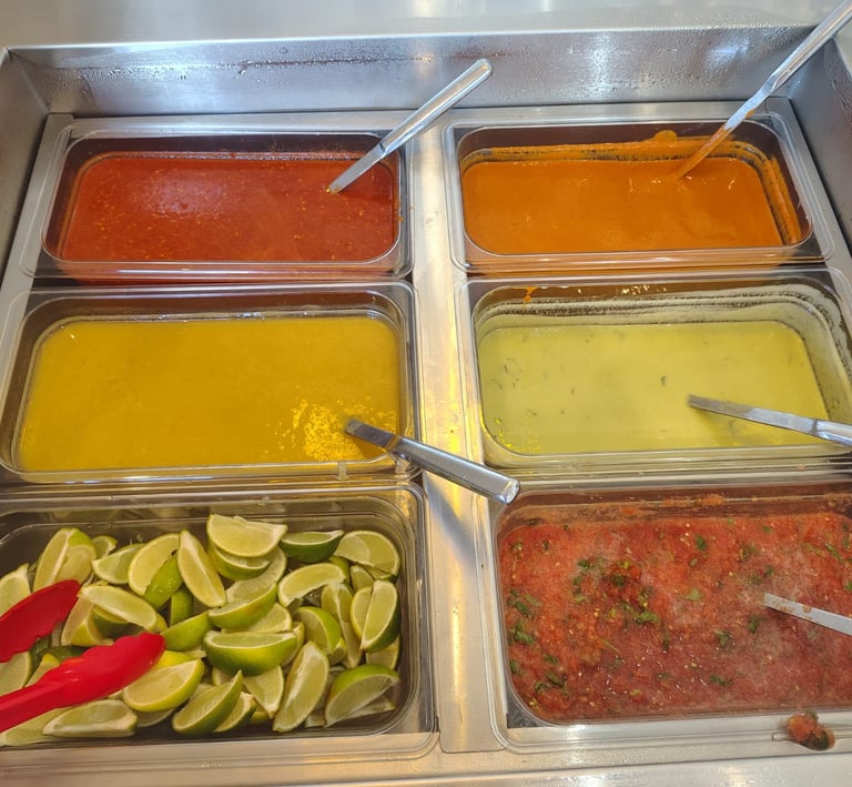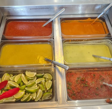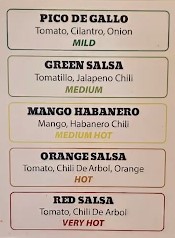 Pico de Gallo, Green Salsa, Mango Habanero, Orange Salsa, Red Salsa, All made in house from the best ingridiants!
